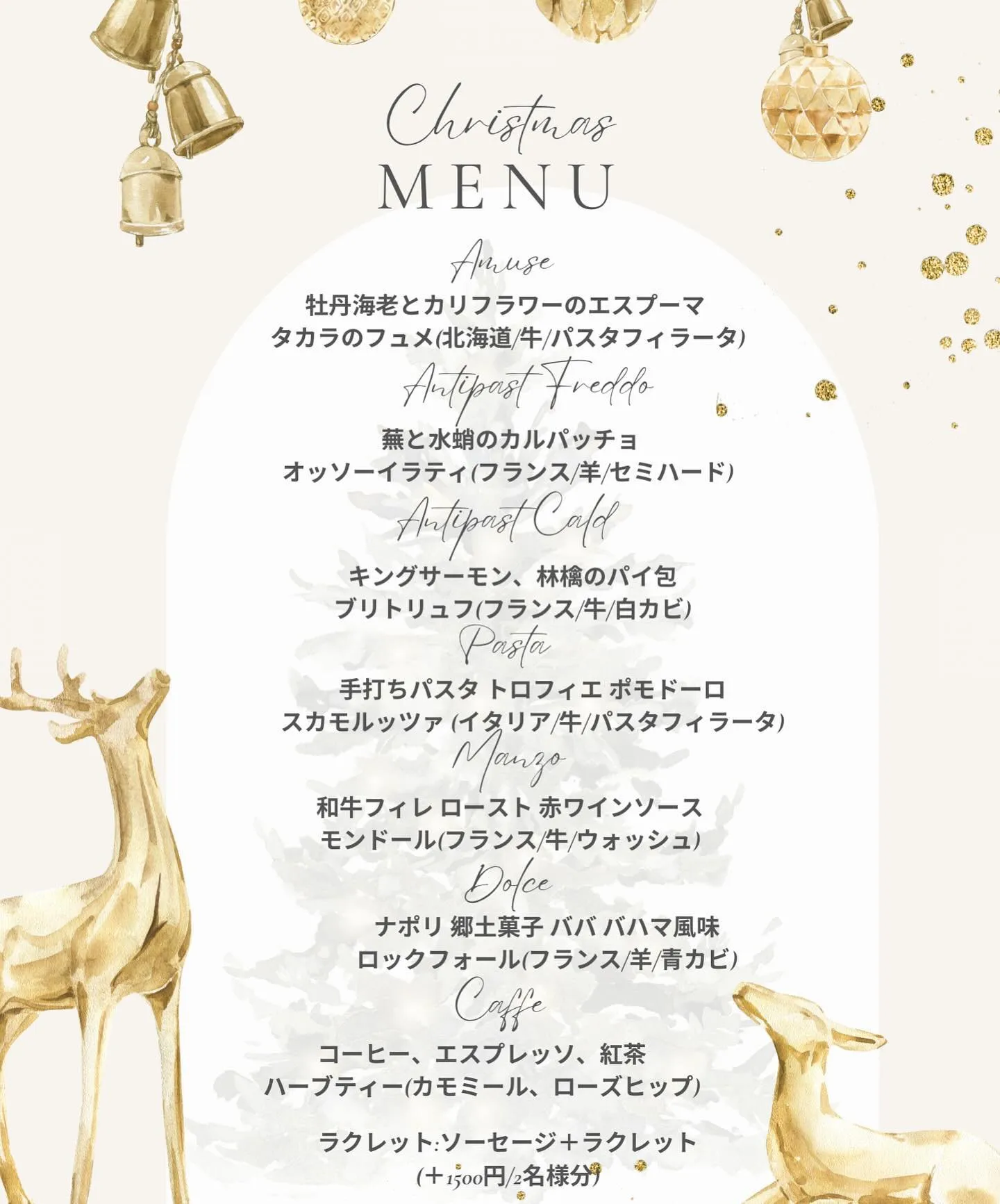 🎄クリスマスコースのご案内🎄12月24.25日はクリスマスコースのみのご案内になっております(*^^*)変更になる可能性もありますが…今のところその予定です!クリスマスしか食べられないチーズをふんだんに使…